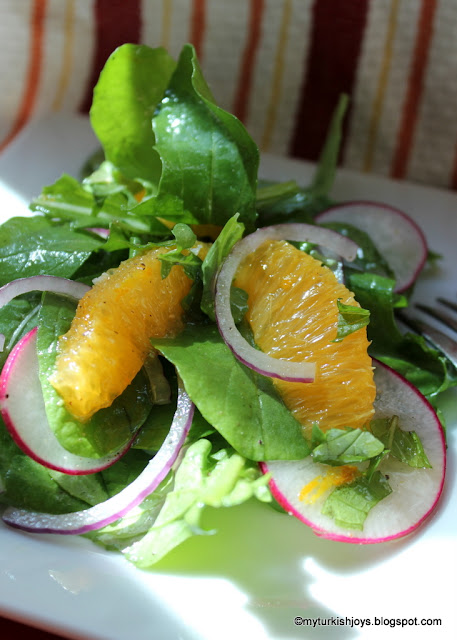 Right now, radishes are readily available at the weekly pazars in Istanbul, so I bought a bunch of red radishes. I decided I would pair them with roka (arugula), red onions and oranges - a little bit of a play off the Italian Insalata Piana dell�Etna. (Note: when I learned this recipe in a cooking class here, we used red onions, oranges, fennel, olive oil and black olives.)