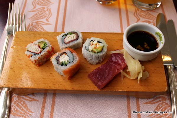 Now, let�s head to the buffet! You�ll find many elements of the traditional Turkish breakfast such as several varieties of cheese and salami, dried fruits, nuts, jams, honey, breads and pastries. However, I opted for more the �exotic� items such as smoked salmon, fresh mozzarella with basil, risotto, freshly carved roast beef, curried chicken and the sushi bar. I was in sushi heaven!